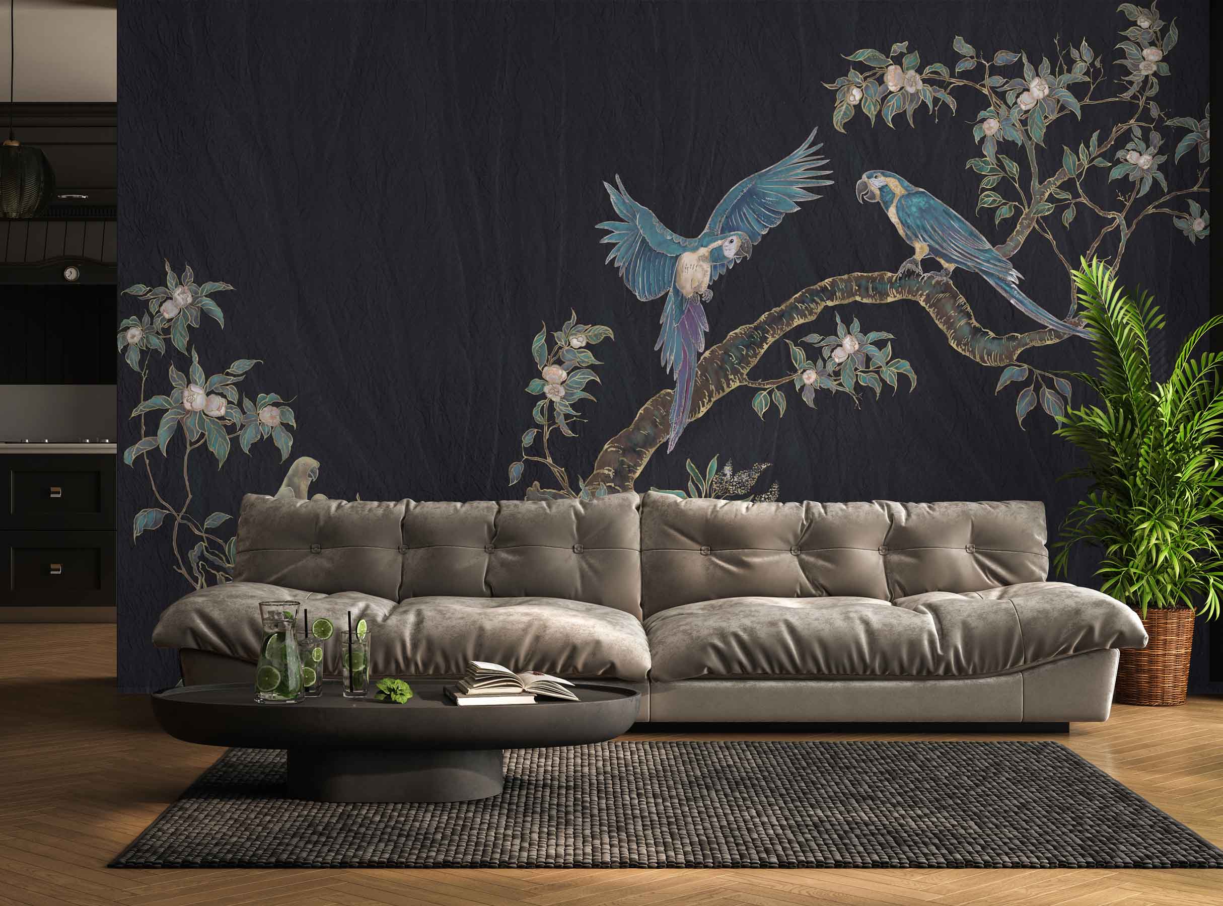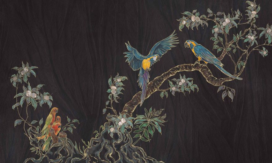 Ręcznie malowana kompozycja inspirowana tropikalną przyrodą i intensywnymi barwami ptaków. Głębokie, ciemne tło kontrastuje z detalicznie opracowanymi papugami, roślinnością i kwiatami.