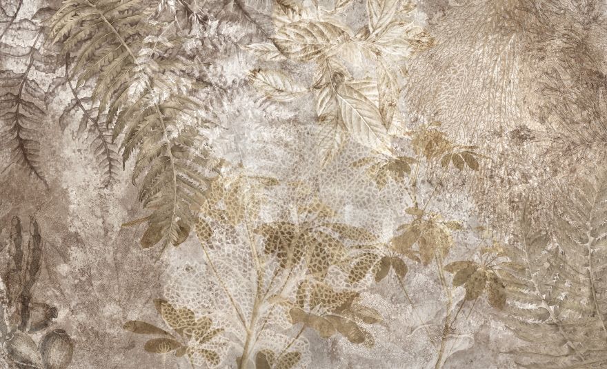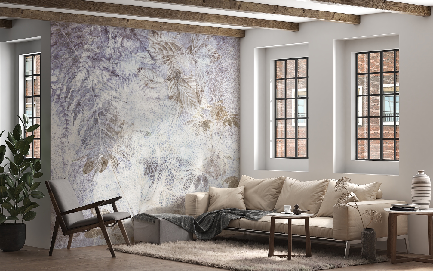 Wzór „Aura” nawiązuje do malarstwa botanicznego, gdzie liście i rośliny były ręcznie malowane, tworząc bogate warstwy i subtelną głębię. Delikatne formy, cieniowanie i stonowane barwy nadają wnętrzu spokojny, naturalny charakter.