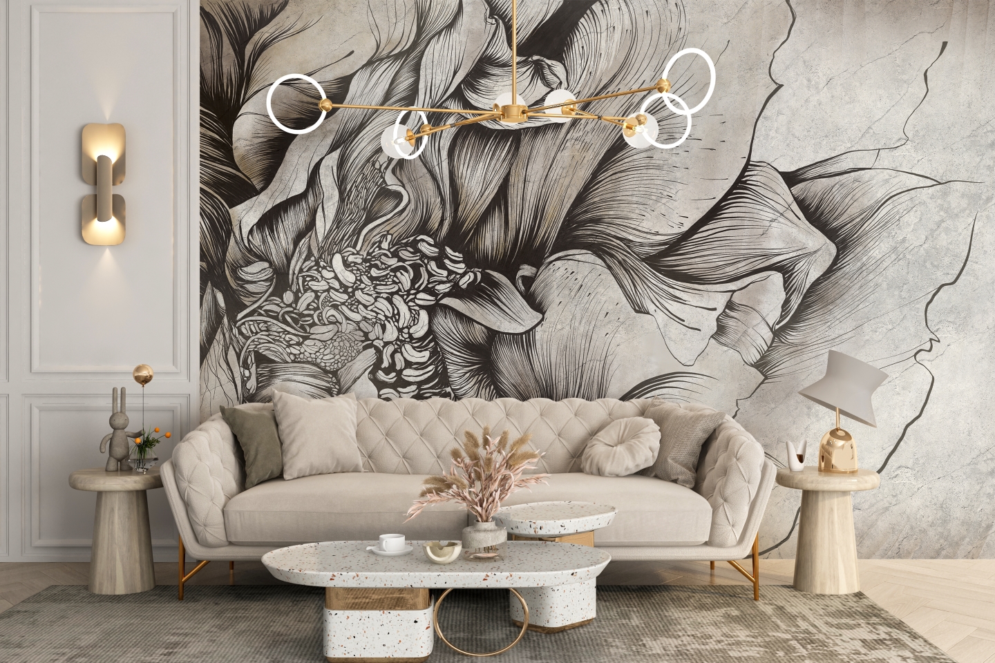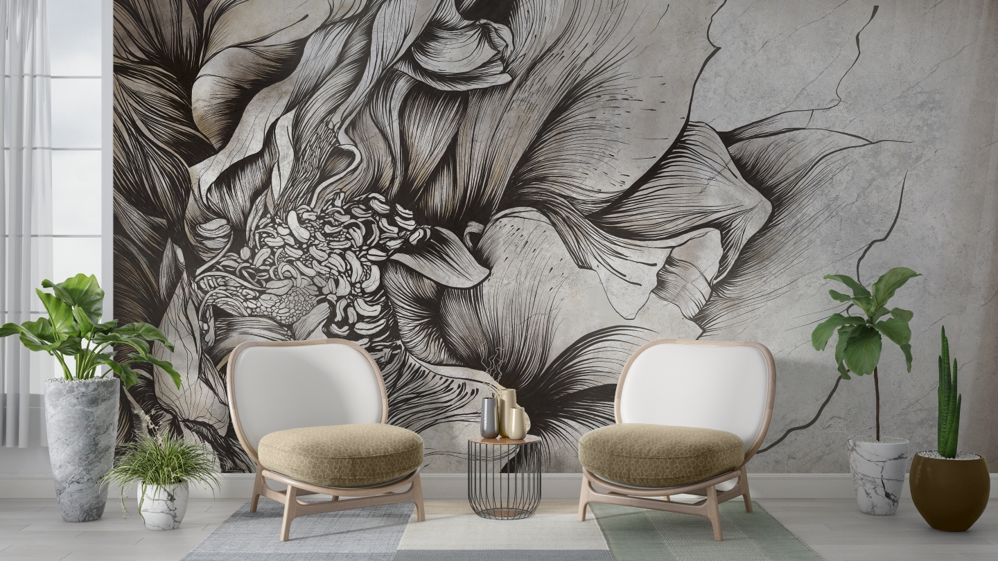 Tapeta Bloom to hołd dla piękna natury, oddany poprzez precyzyjne linie i delikatne przejścia cieni. Ten mural to coś więcej niż dekoracja – to jak ręcznie rysowany portret kwiatu, który zachwyca swoją organiczną teksturą i detalem. Idealnie wpasowuje się w przestrzeń, dodając jej wyrazistości i artystycznego charakteru. Doskonały wybór dla tych, którzy szukają wyjątkowej formy sztuki na ścianie.