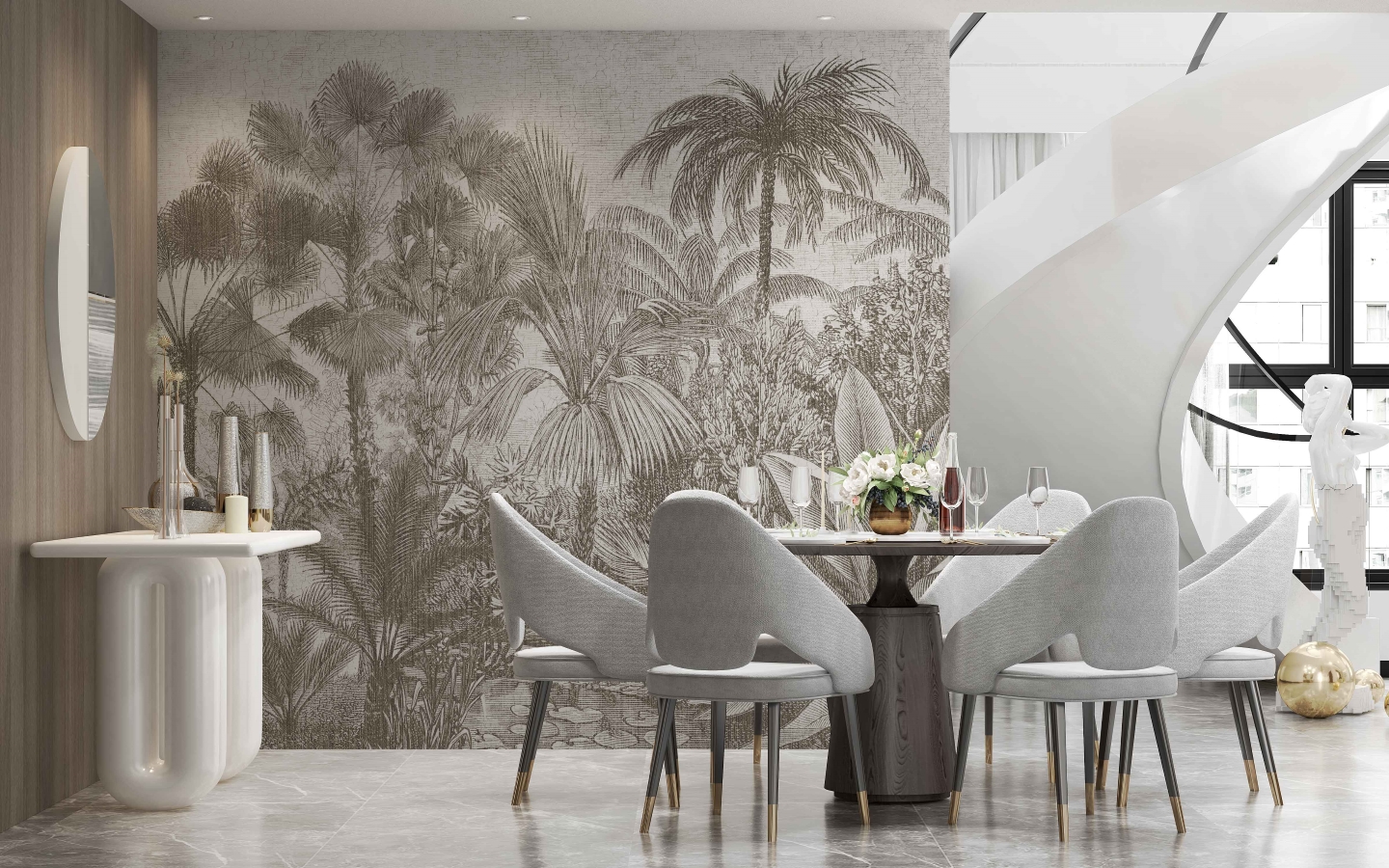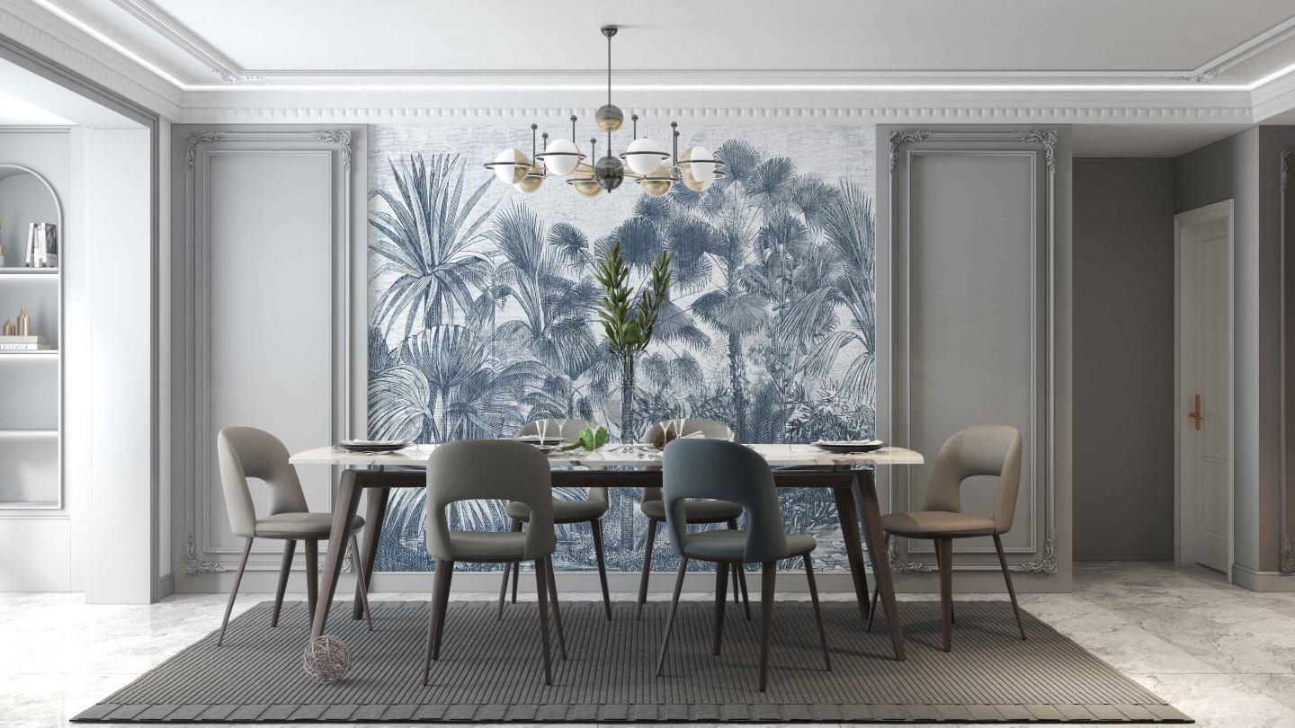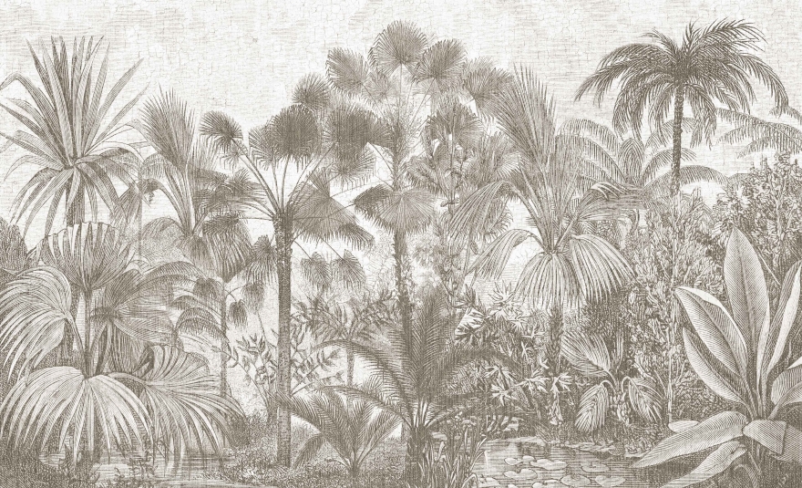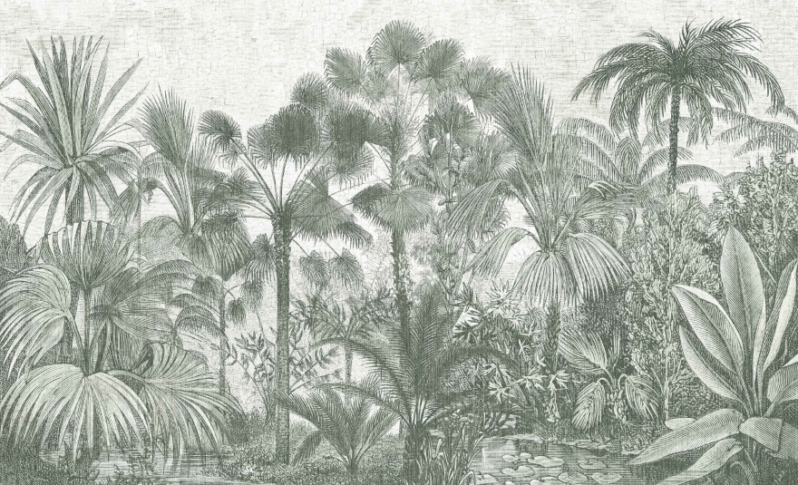 Wzór Borneo przenosi nas do świata egzotycznej roślinności. Inspirowany klasycznymi rycinami botanicznymi, wzór odtwarza z niezwykłą precyzją detale tropikalnych liści i palm. Wyjątkowość tej kompozycji tkwi w delikatnych liniach i bogactwie tekstur, które tworzą przestrzenny efekt, jakby tropikalny ogród rozciągał się tuż przed nami. To idealne rozwiązanie dla wnętrz, które pragną przyciągnąć wzrok i wprowadzić naturalny akcent.