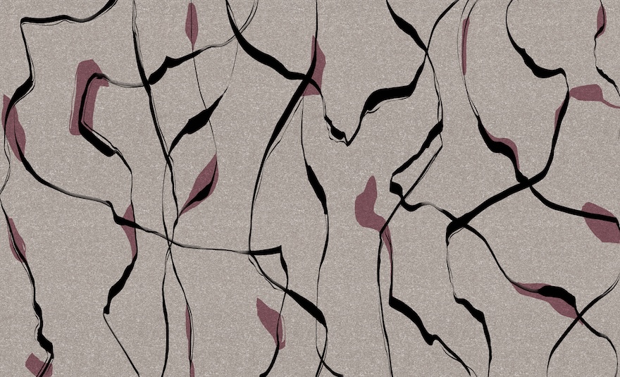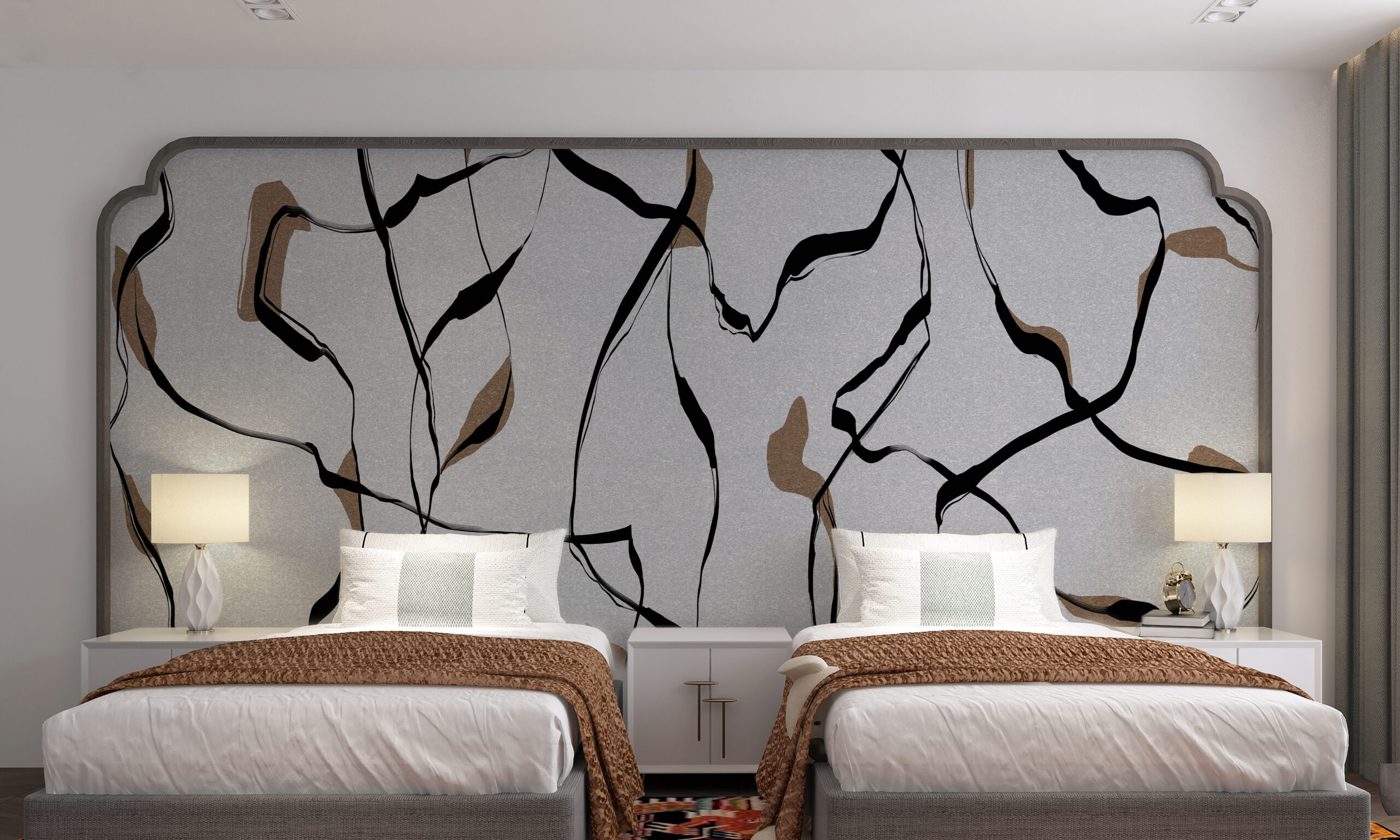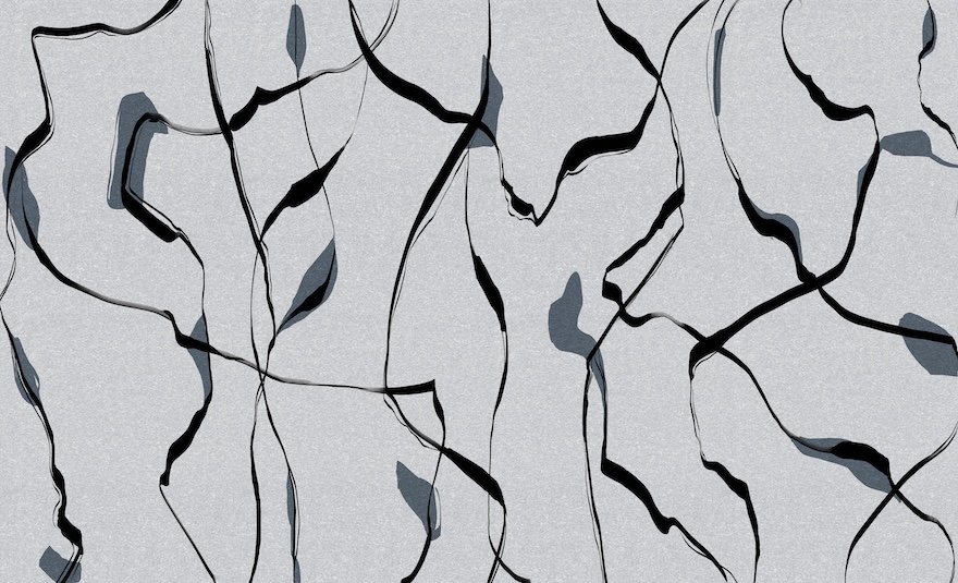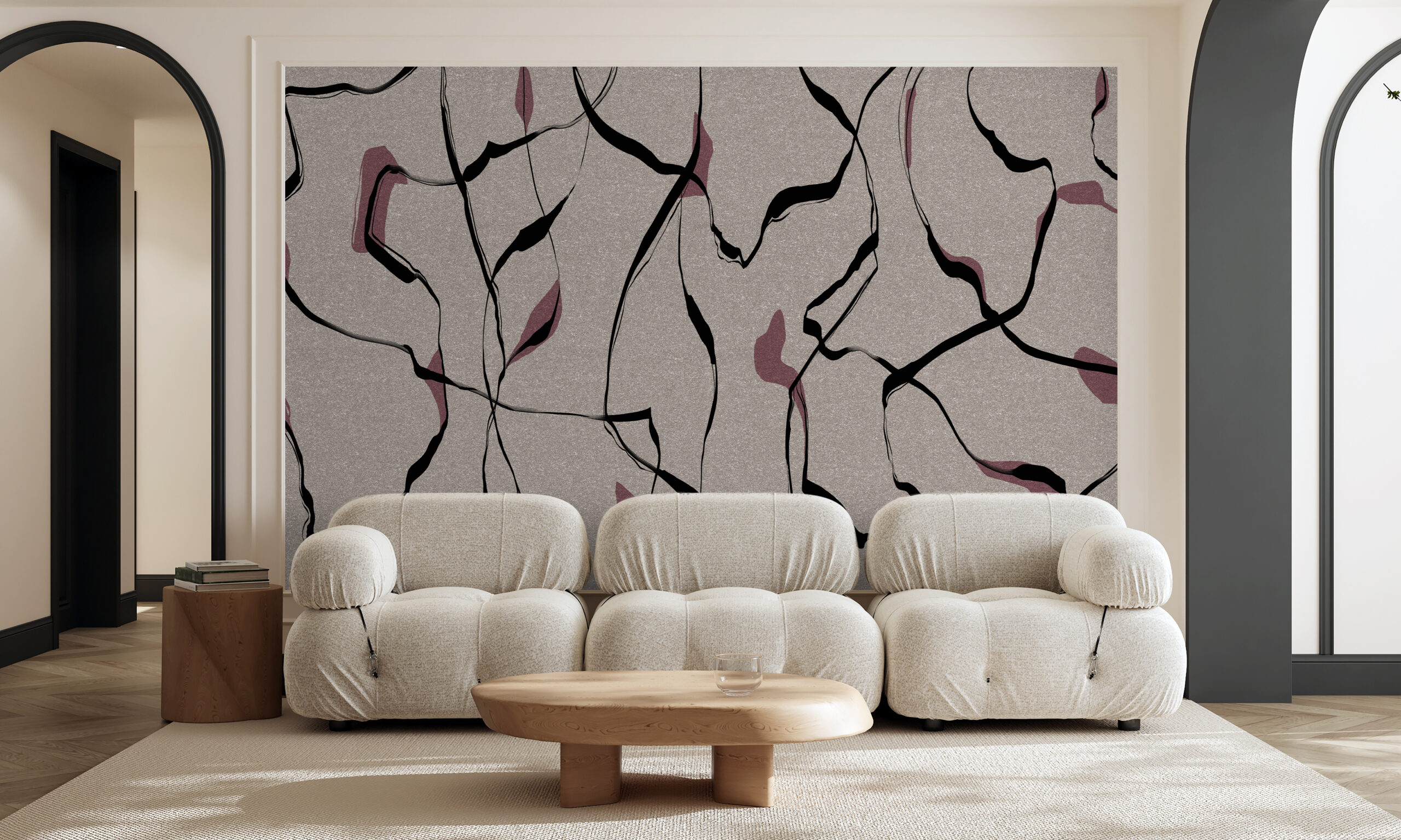 Nowoczesna, graficzna tapeta o abstrakcyjnym, linearnym rysunku. Wzór przypomina strukturę skał, korzeni, wodnych żył lub szkic wykonany jednym płynnym ruchem pędzla. Subtelna, nieregularna sieć linii tworzy organiczny rytm, który wprowadza do wnętrza harmonię i spokój.