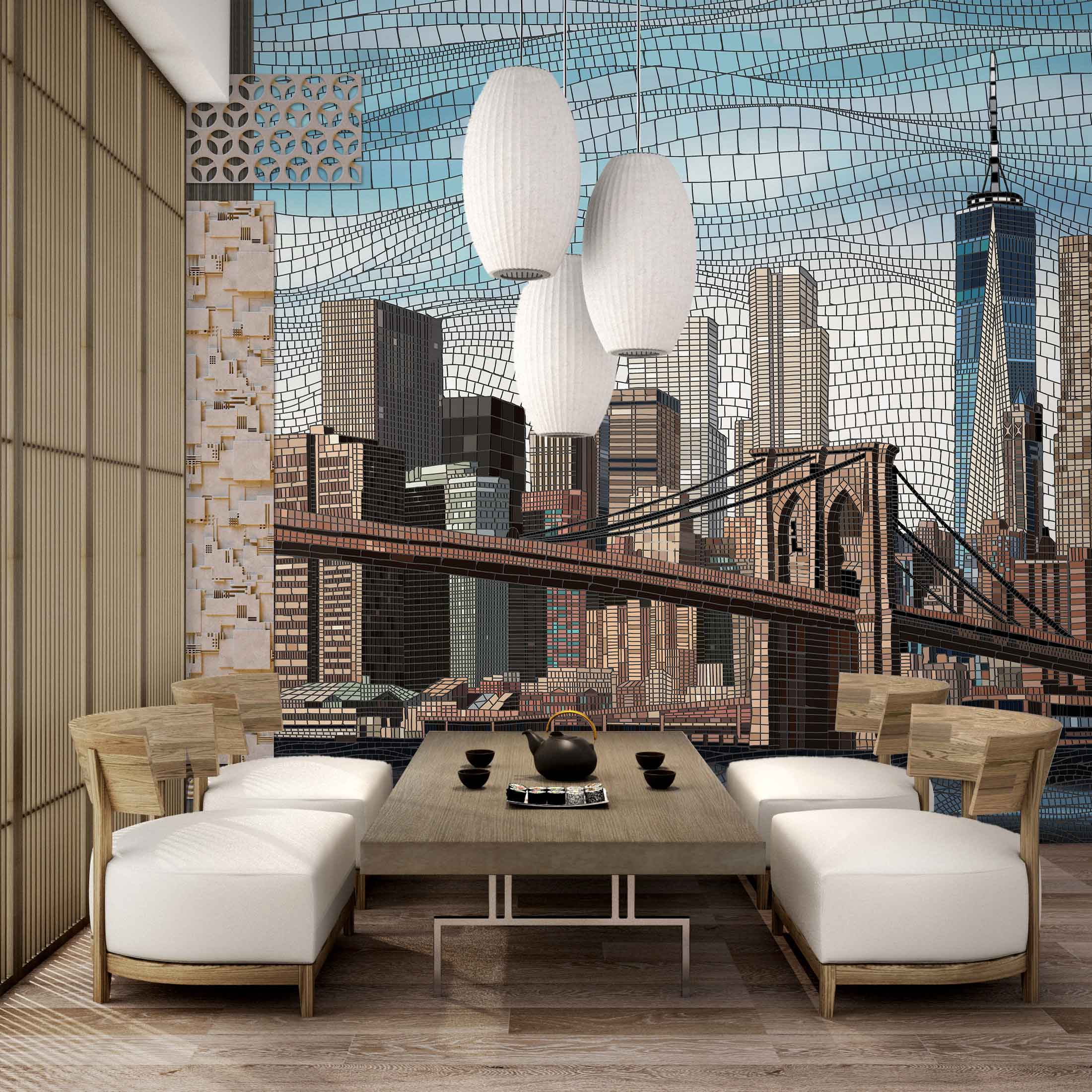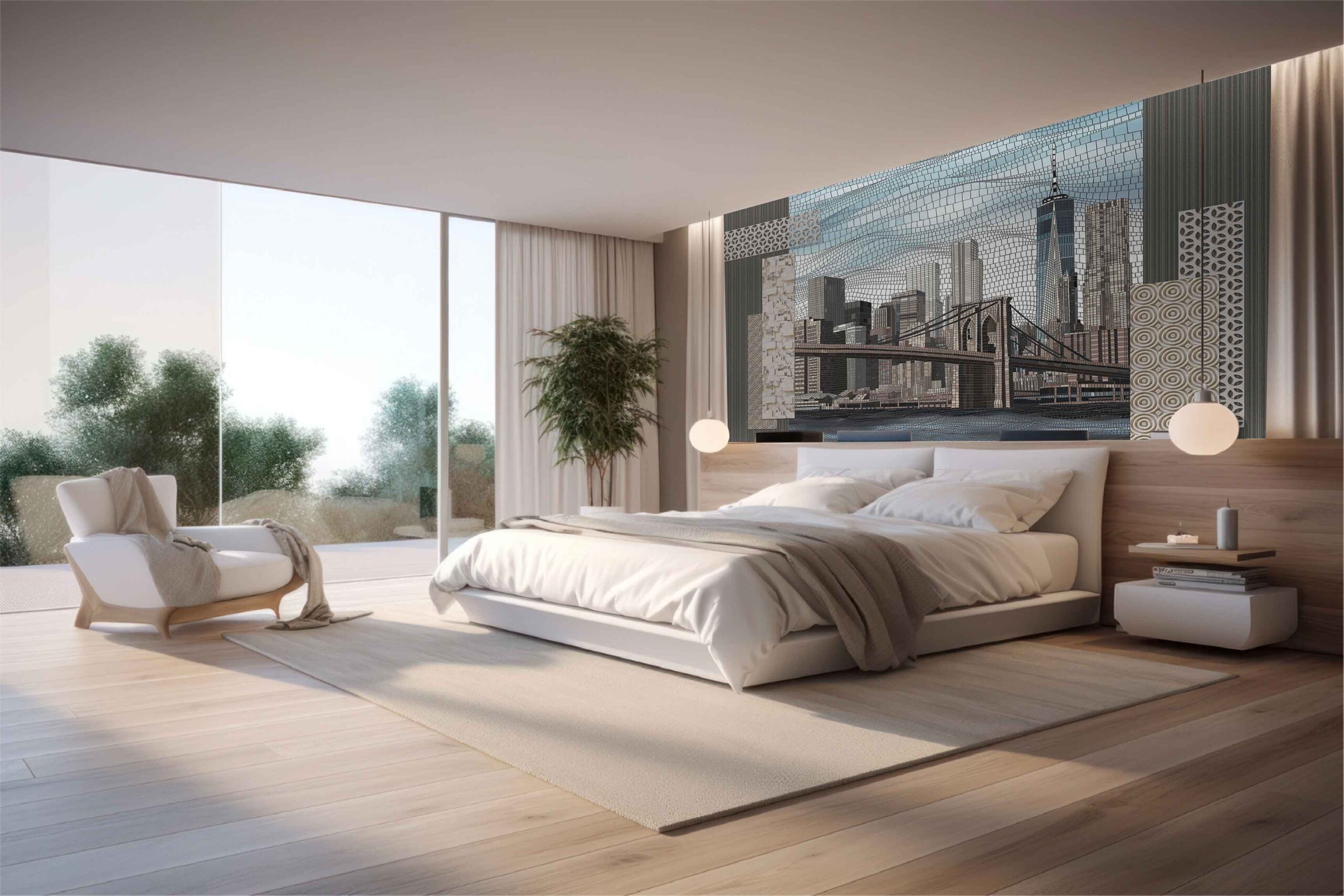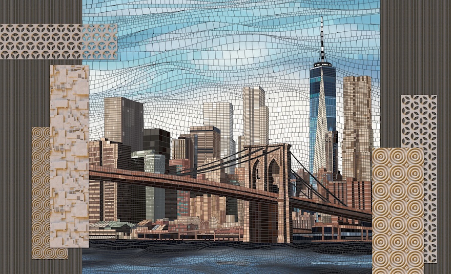 Most i panorama Nowego Jorku tworzą dynamiczną, a zarazem uporządkowaną kompozycję – jak echo miasta zapisane w drobnych fragmentach koloru i światła.