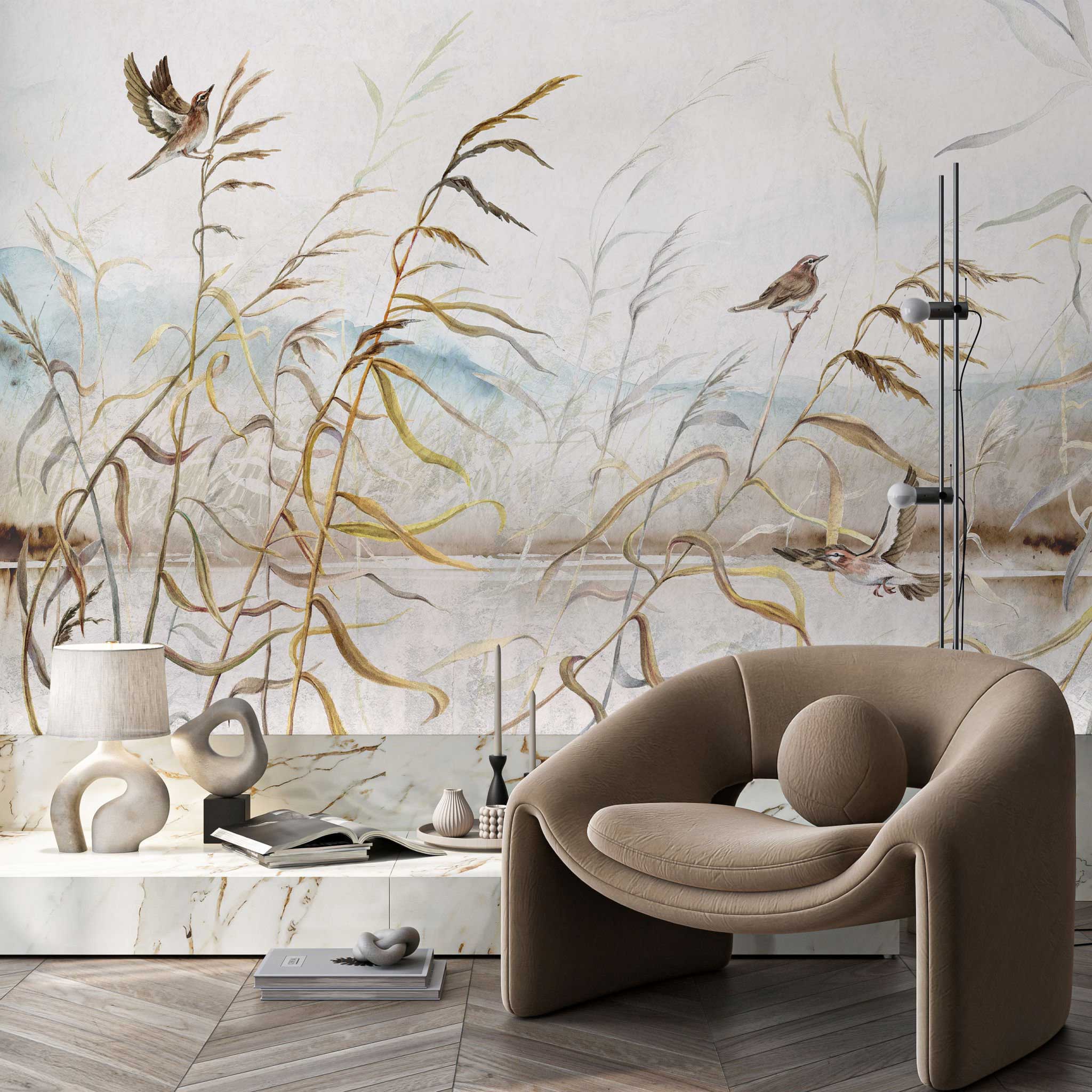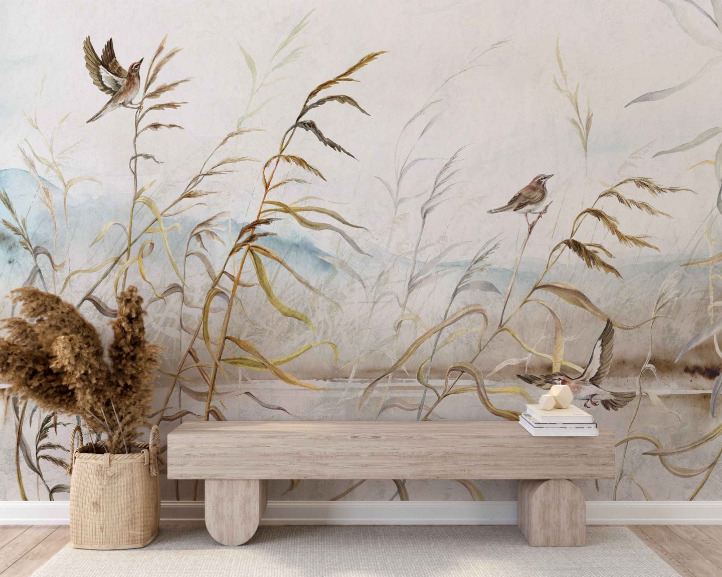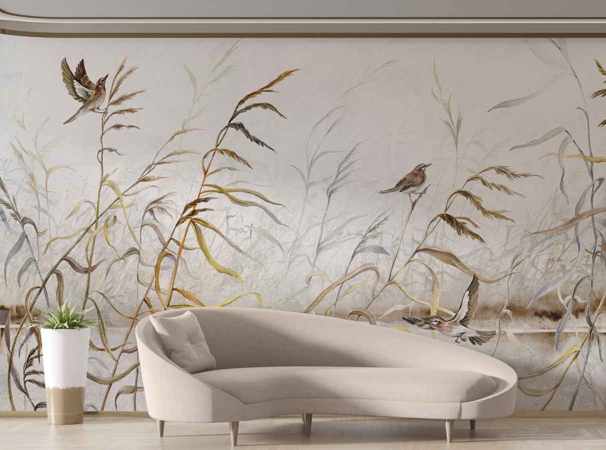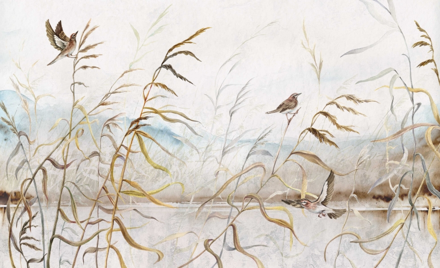 Tapeta Pampa to delikatny, artystyczny hołd dla natury, który przenosi nas w przestrzeń spokojnych pól i traw. Wzór przedstawia wysokie, trawiaste łodygi i subtelne ptaki, oddając wrażenie ruchu i wiatru. Artystyczna technika malarska przypomina akwarele, co nadaje jej lekkości i subtelnej faktury. Efekt końcowy tworzy iluzję ręcznie malowanego dzieła, które emanuje naturalnym pięknem i harmonią.