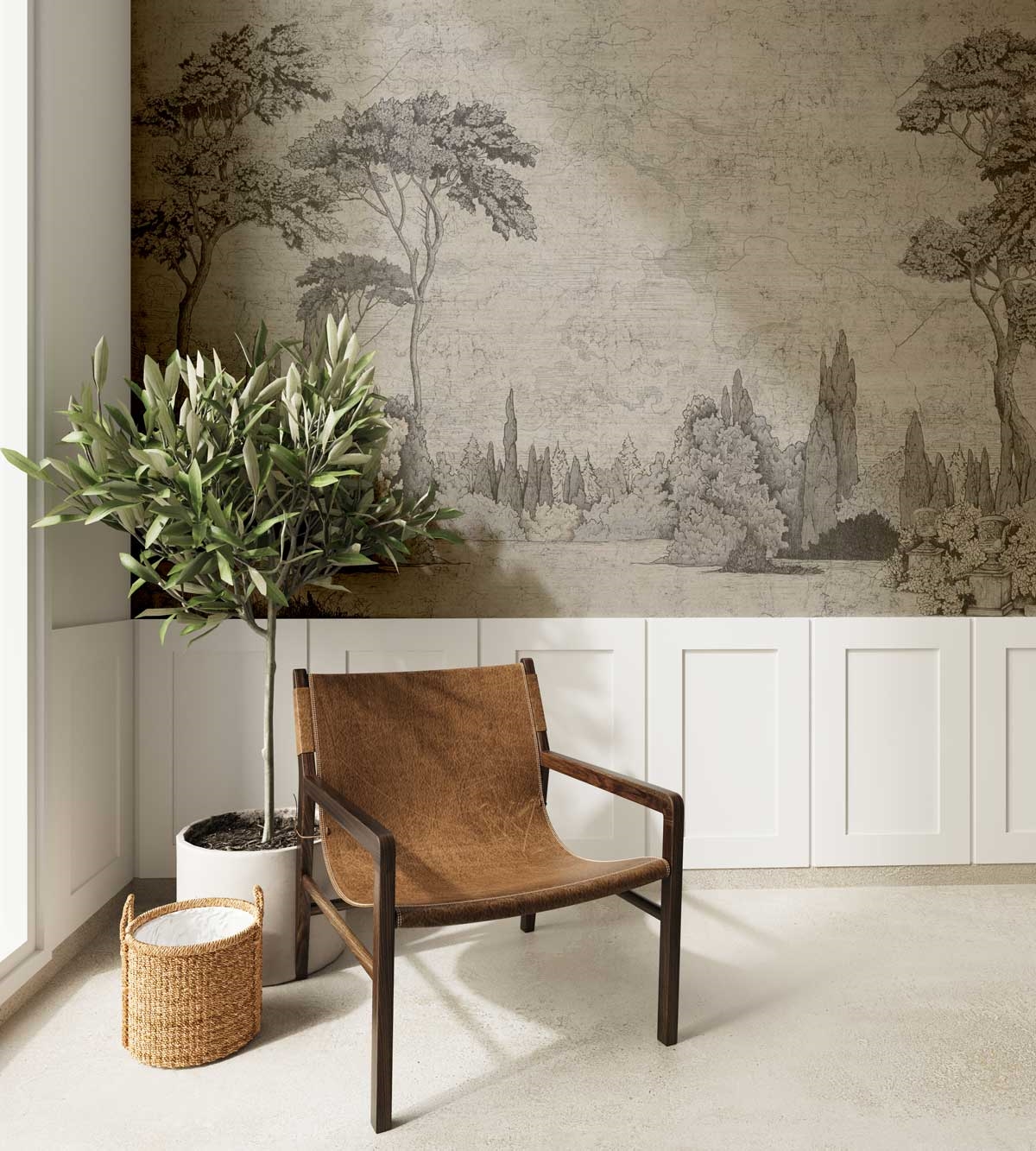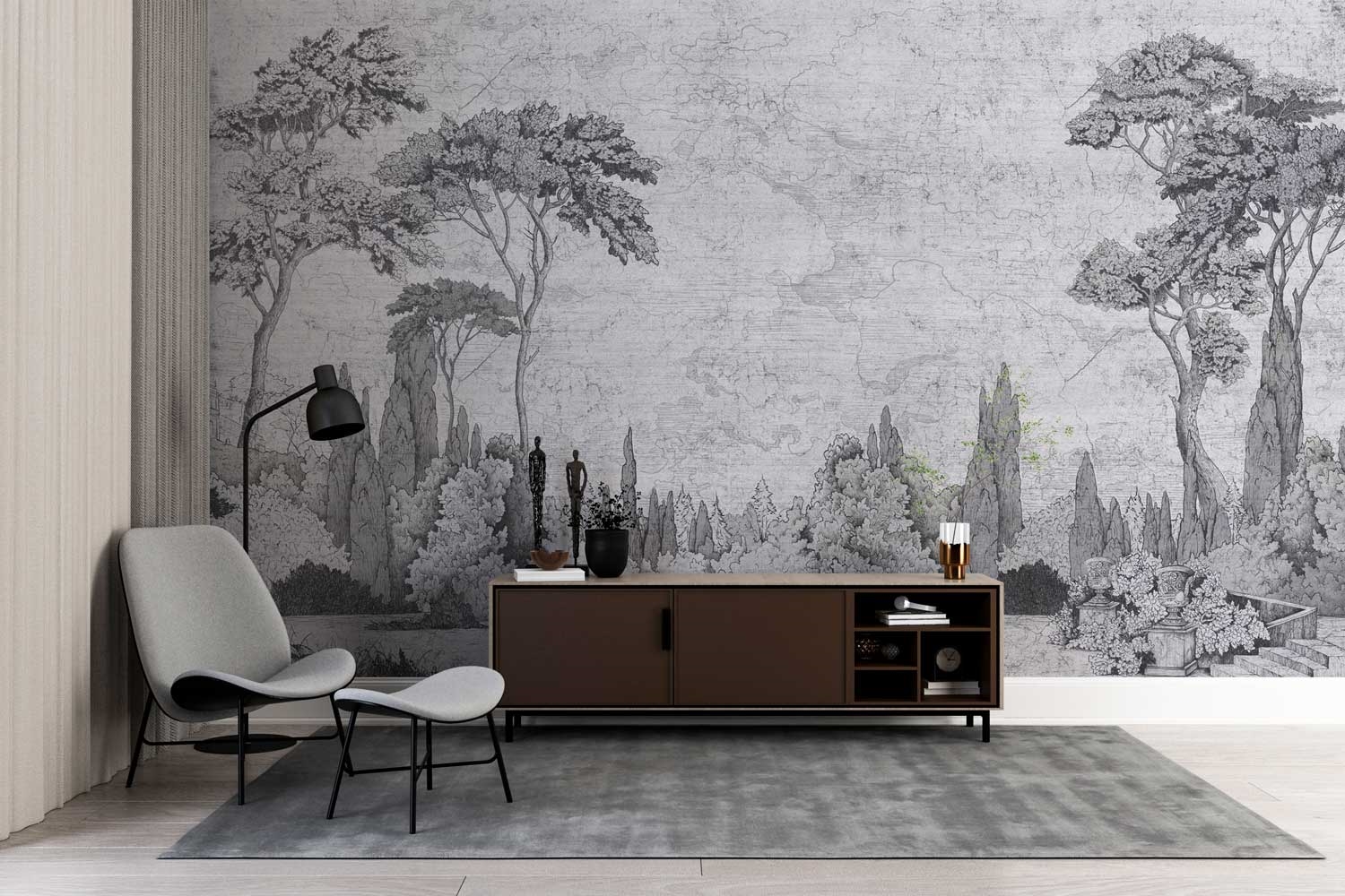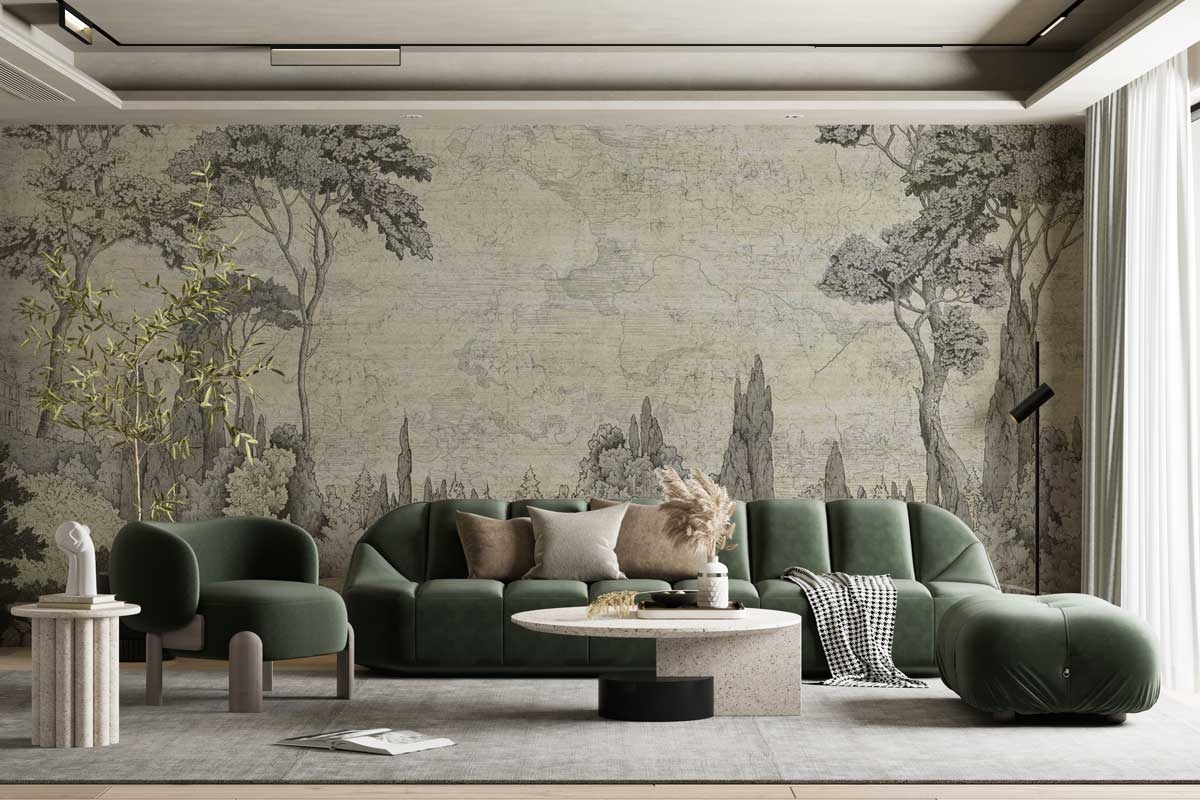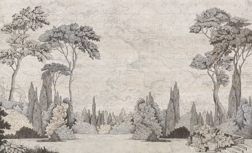 Wzór Parma nawiązuje do tradycyjnej sztuki krajobrazowej, tworząc przestrzeń pełną spokoju i elegancji. Dzięki szczegółowej kresce i subtelnej kolorystyce, ten mural przywołuje na myśl dawne techniki malarskie i grafikę w stylu etching. Przedstawiona kompozycja drzew, krzewów i spokojnej scenerii przypomina ręcznie wykonany rysunek, dodając przestrzeni głębi i wyrafinowania.