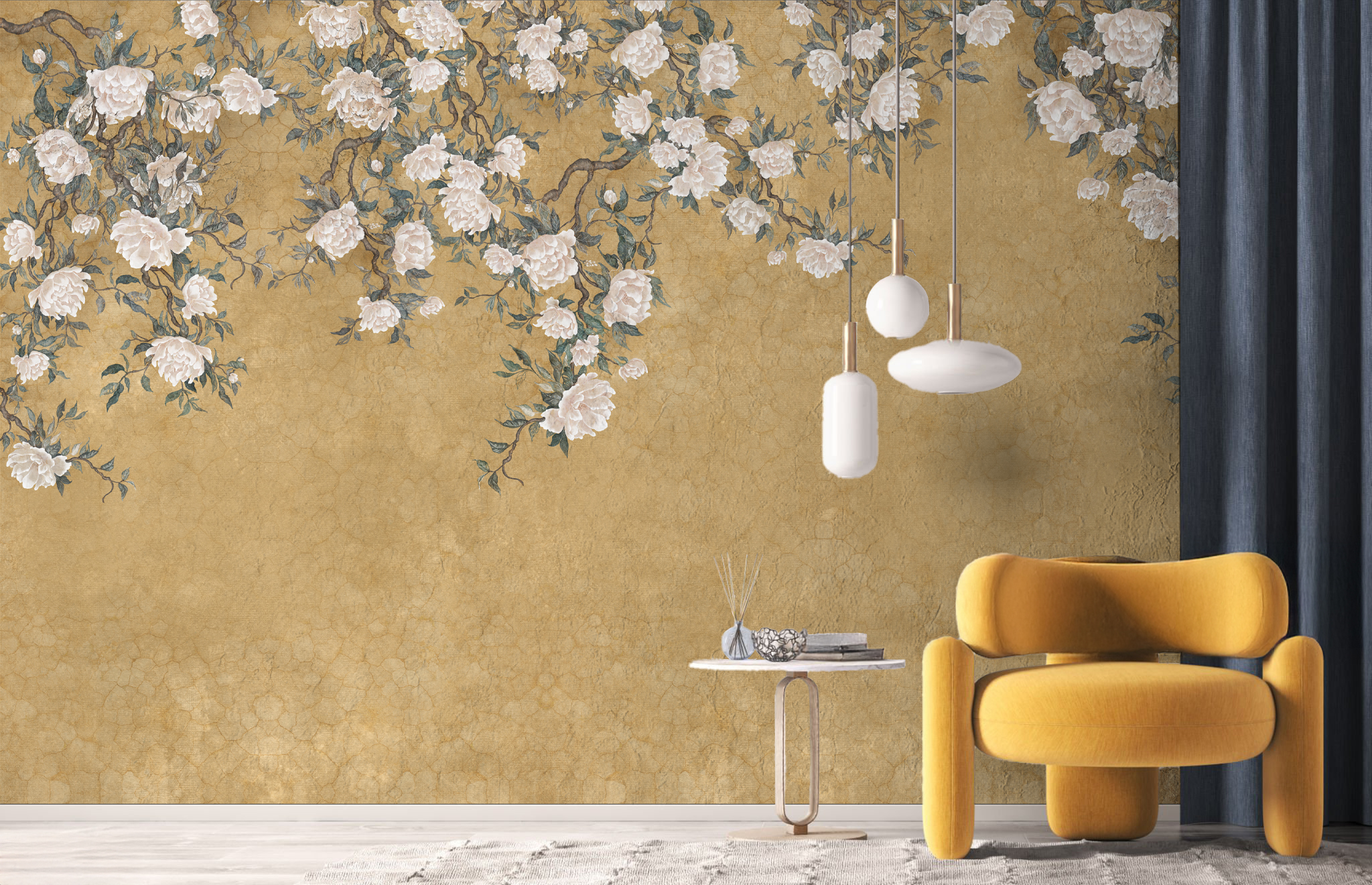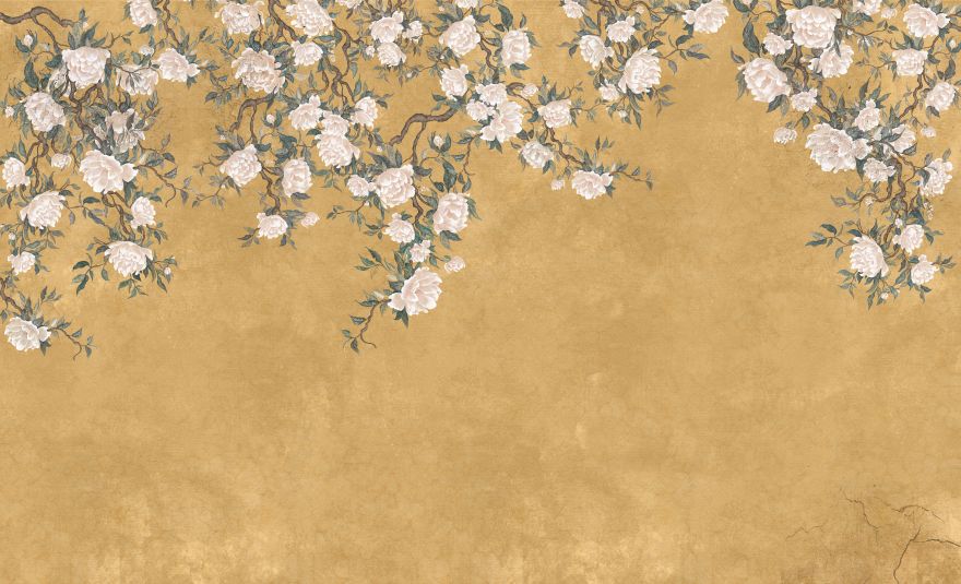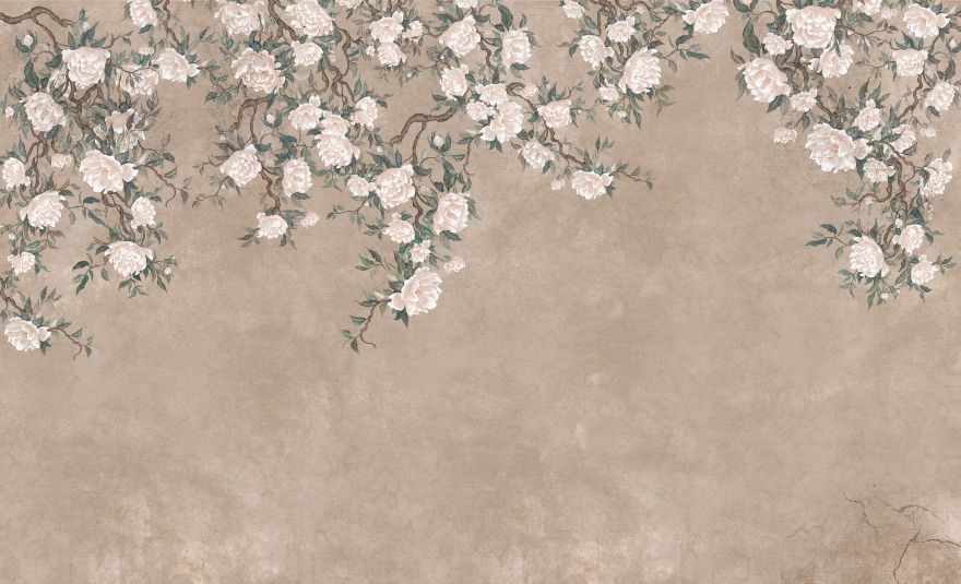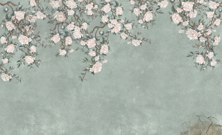 Solea to tapeta, która subtelnie wprowadza do wnętrza światło, lekkośći kwiatową harmonię. Kremowe kwiaty, niczym malowane pędzlem na ręcznie postarzanym jedwabiu, rozkwitają na tle w odcieniach piasku, błękitu i miękkiej zieleni.