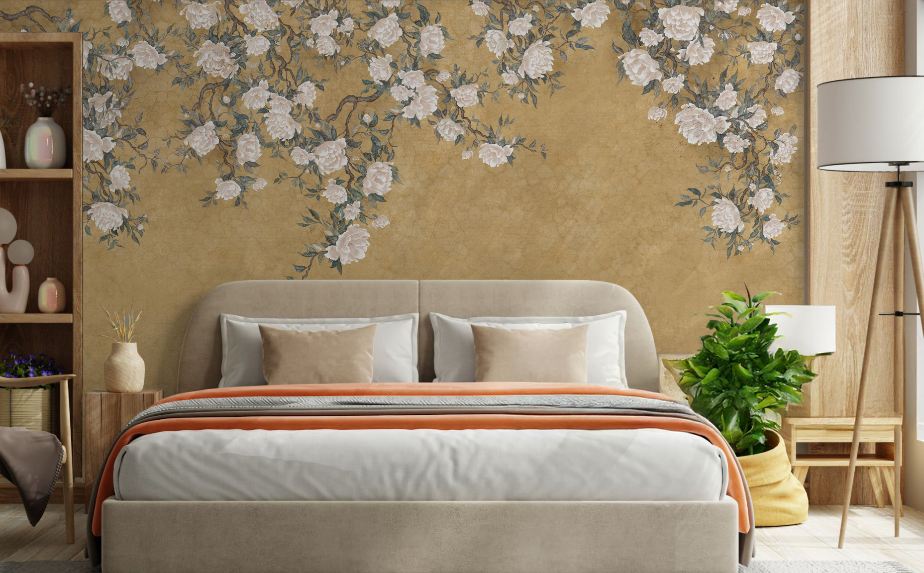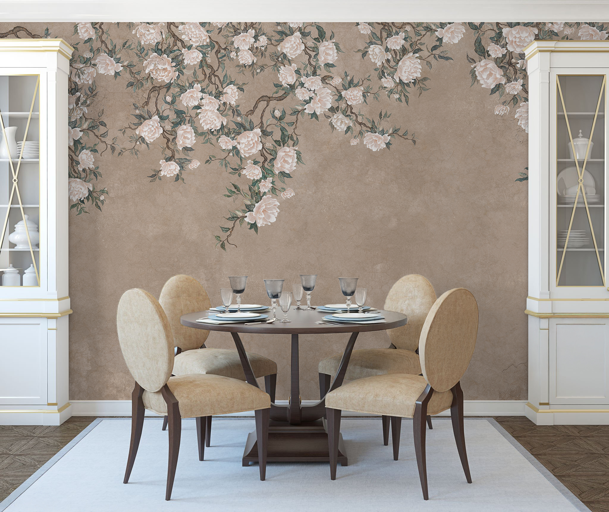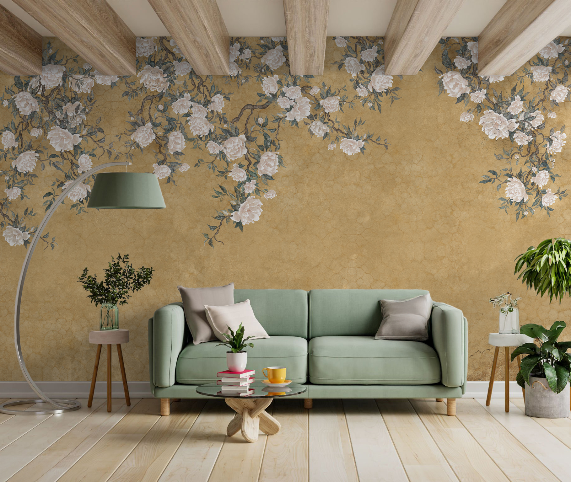 Solea to tapeta, która subtelnie wprowadza do wnętrza światło, lekkośći kwiatową harmonię. Kremowe kwiaty, niczym malowane pędzlem na ręcznie postarzanym jedwabiu, rozkwitają na tle w odcieniach piasku, błękitu i miękkiej zieleni.