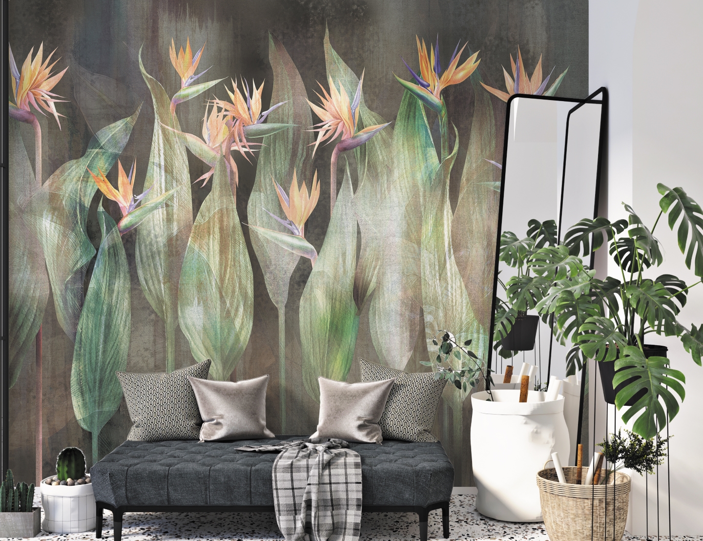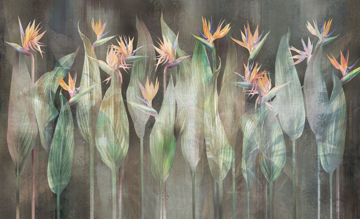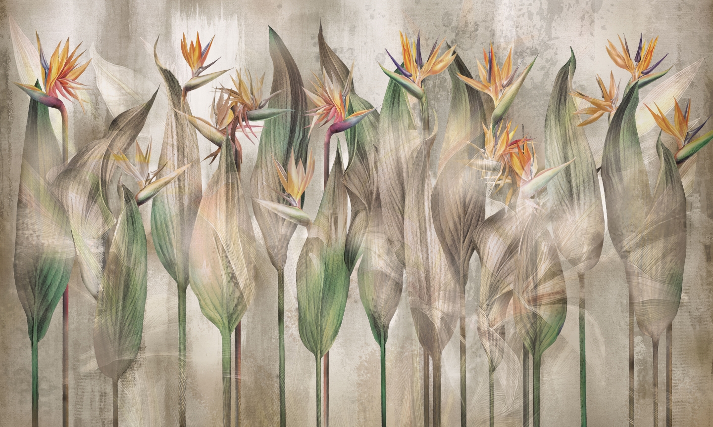 Tapeta Sterlicia oddaje piękno „rajskich ptaków” z nutą tajemniczej poświaty, która podkreśla egzotyczny charakter tego kwiatu.  Warstwowa technika i delikatne przejścia kolorów nadają całości efekt głębi i blasku, jakby rośliny były oświetlone subtelnym, naturalnym światłem. Ten mural wprowadza do wnętrza elegancję i harmonię natury, tworząc atmosferę wyjątkowego spokoju i piękna. Doskonały wybór dla tych, którzy szukają wyjątkowego akcentu inspirowanego naturą.
